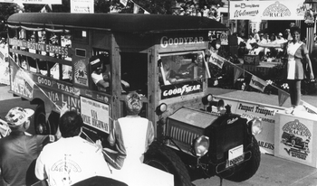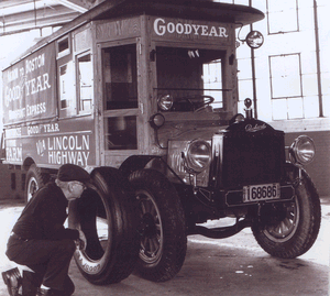 Allerdings war man bei Goodyear wohl selbst noch nicht so ganz vom Erfolg dieses Tests überzeugt und schickte sicherheitshalber zwei Begleitfahrzeuge mit auf die Tour. Deren Ladung bestand außer dem üblichen Werkzeug aus 60 Litern Öl, 40 Litern Benzin und 60 Litern Wasser. Und in weiser Voraussicht war für alle Fälle ein Pressluftgerät zum Aufpumpen der Reifen an Bord. Erster Zwangsstopp in Edinburg/Ohio. Aber diesmal noch nicht einer ReifenPanne wegen. „Old John Packard“ war im Matsch versackt. Ausgerechnet bei der Konkurrenz musste Hilfe geholt werden. Der Fünftonner wurde mit einem Eisenbahn-Hebegerät wieder flottgemacht. Danach ging es „zügig“ auf der Straße weiter. Abgesehen davon, dass etwa alle 140 Kilometer einem Reifen buchstäblich die Luft ausging. Das Pressluftgerät bekam reichlich Arbeit... Allen