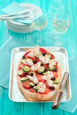 Mit Tomatenpüree bestreichen, mit Fischstreifen, Zucchini, Tomaten und Oliven