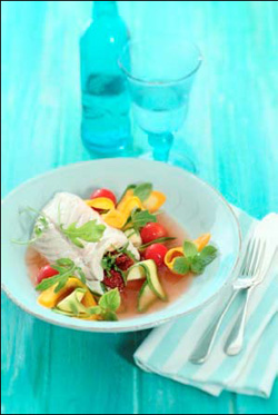 Seelachs mit Zucchinisalat darauf Tomatensud anrichten und mit