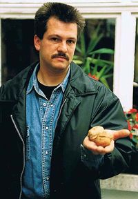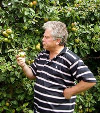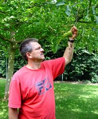 Da steht er stolz und selbstbewusst, ein Kerl wie ein (Walnuss) Baum. Lorenz Schäffler aus Kreis Kirchheimbolanden in der Pfalz streckt uns die Hand entgegen – gefüllt mit Walnüssen, die nicht von dieser Welt zu stammen scheinen. Und doch sind sie die Frucht eines ganz normalen „Nussbaumes“, der sich hinter dem 48 jährigen zu imposanter Größe aufreckt. Gepflanzt hat er ihn eigenhändig als kleines Bäumchen vor zehn Jahren, das er von seinem Schwiegervater erhielt. Mittlerweile hat Schäfflers Walnussbaum (Júglans régia) eine Höhe von über zehn Metern erreicht, immerhin ein Drittel seiner möglichen Wuchsgröße. Somit wird die Ernte der Tennisballgroßen Walnüsse! zu einer echten Herausforderung, denn wem aus dieser Höhe eine Nuss auf seine Nuss fällt, dem gehen möglicherweise die Lichter aus. Ganz sicher wird Lorenz Schäffler seinen Kopf und die Köpfe seiner Gäste entsprechend zu schützen wissen, wenn die Erntezeit naht. Dann hat Lorenz alle Hände voll zu tun, denn im Schnitt erntet der fleißige Pfälzer zwischen 300 und 400 Nüssen pro Saison. Natürlich möchte der Leser erfahren, warum Lorenz die dicksten Nüsse in der Pfalz von seinem Walnussbaum pflückt? Die Antwort ist so einfach, dass man sie kaum für möglich hält. Kuhmist oder Kuhfladen, den älteren Lesern aus eigener handfester Erfahrung bekannt, den Jüngeren und Kindern zumindest vom Kinderbauernhof oder vom Urlaub auf dem Lande. Im Frühjahr und Herbst verpasst Lorenz Schäffler seinem Nussbaum eine saftige Kuhmistpackung, welche den Walnussbaum so richtig auf Trab bringt. Hinzu kommt noch der Nährstoffreiche Untergrund, der auf die Überschwemmungen der Alsenz zurück geht und dem Bäumchen zusätzlichen Treibstoff liefert. Kuh- und Pferdemist, das ist bei Gärtnern und Gartenliebhabern hinlänglich bekannt, erzeugt durch seine Verrottung im Boden Wärme. Wer also im Frühsommer Tomaten, Erdbeeren, Zucchini oder Paprika ernten will, der sollte seinen Pflänzchen die nötige Starttemperatur gewähren. Doch zurück zum Walnussbaum.